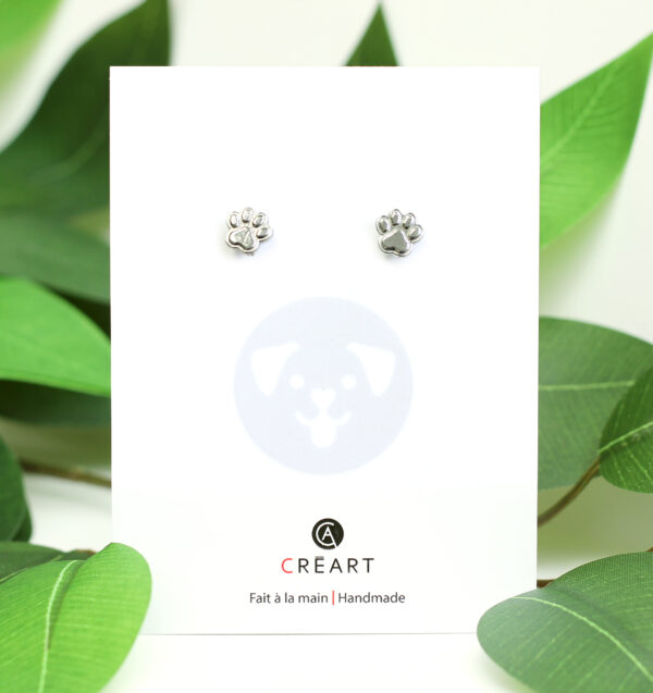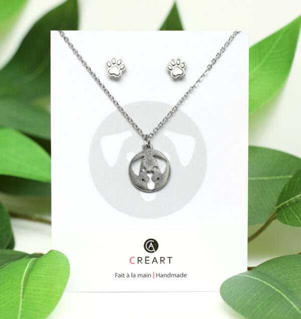 Le pendentif est disposé sur un carton de présentation avec un descriptif de l’entreprise et des matières utilisées.